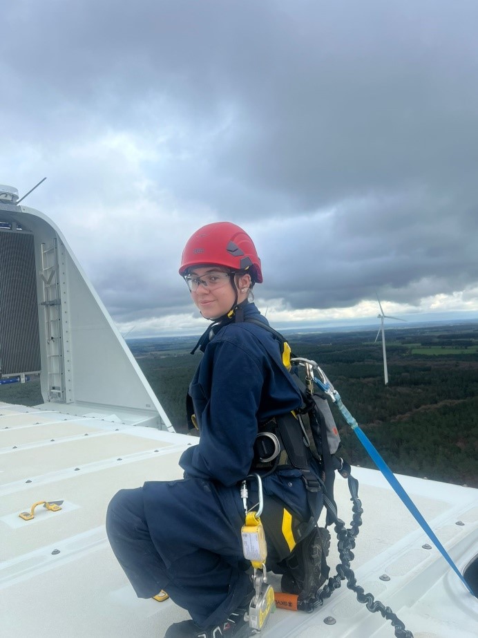 Actualmente, Laura está trabajando en VESTAS. Nos manda esta foto y nos dice que está en Francia, realizando la inspección del “cooler” del aerogenerador de la foto.