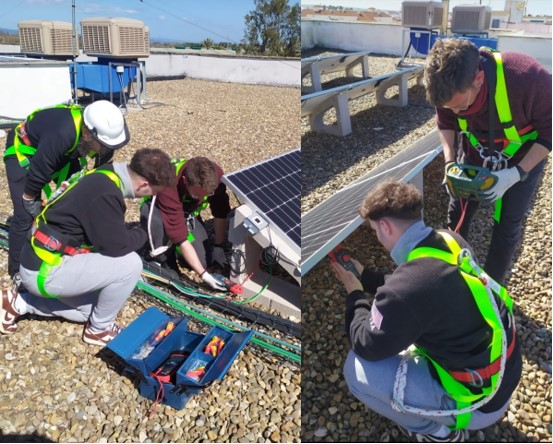 Manuel Moreno, Rafael Díaz y José Martínez están realizando mediciones de aislamiento y consumo de la instalación fotovoltaica de nuestro instituto. Realizan el primer curso y están realizando la formación en Torresol Energy, SolarTree, y La Africana Energía.