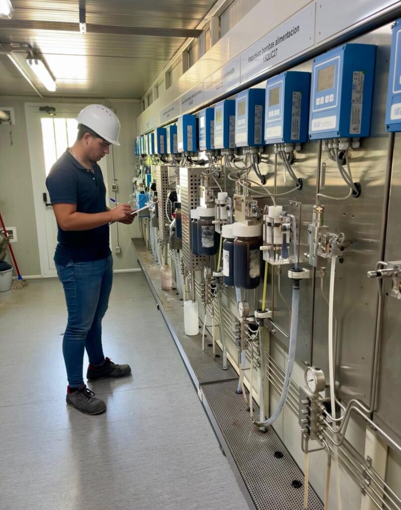 José Santos es de Santiago de la Espada, Jaén. Realiza el primer curso, en la foto está revisando los parámetros de las muestras del ciclo agua-vapor para la generación de electricidad en la planta termosolar "La Africana".